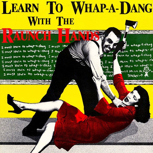 Have I mentioned The Raunch Hands before? I'm still on my nostalgic psychobilly kick, and The Raunch Hands are another band I discovered around the same time as I found The Cramps. I'm not an expert on the New York band, but I know I wore out my tape of their second album, 1986's Learn to Whap-a-Dang with The Raunch Hands back in my 90s college days. (Warning: That link autoplays unless you've already told YouTube not to do it.) The music veers closer to old-school country and western than most rockabilly groups, and it's one of the things I find endearing about the band. The Raunch Hands are also unapologetically silly, frequently obnoxious, and undeniably catchy. Sexual misadventures, drunkenness, and ... well, that's it, mostly ... are the themes propelling listeners from song to song, and none of it is taken seriously at all. The Raunch Hands haven't put out an album since 2008, and sadly we lost frontman Mike Chandler to illness just last year, which means that's probably the end of new music from the band. Thankfully, we can always Learn to Whap-a-Dang.