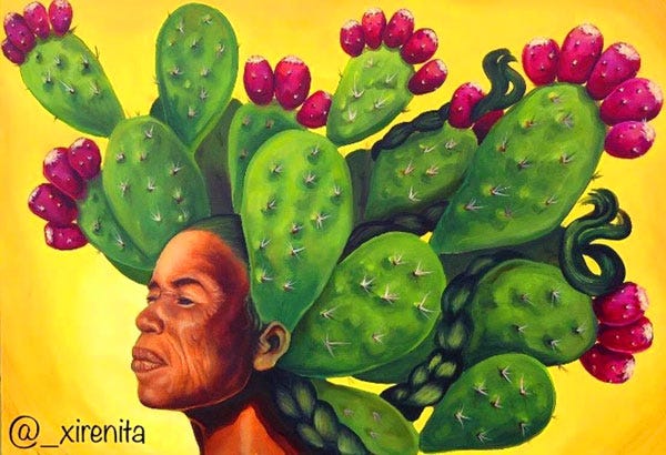 My phone is embarrassingly full of pictures of my cat lately, and the few non-cat photos I've taken honestly aren't very good. So instead I'm sharing this image of a painting by Irene O'Connell, who goes by @_xirenita on Instagram. This beautifully powerful piece is titled La Nopalera, and in the artist's own words, represents women "who have endured so much, carried so much burden, pressed on through so much resistance. Yet they continue to rise, with strong spines filled with courage, bearing fruit in even the harshest conditions."